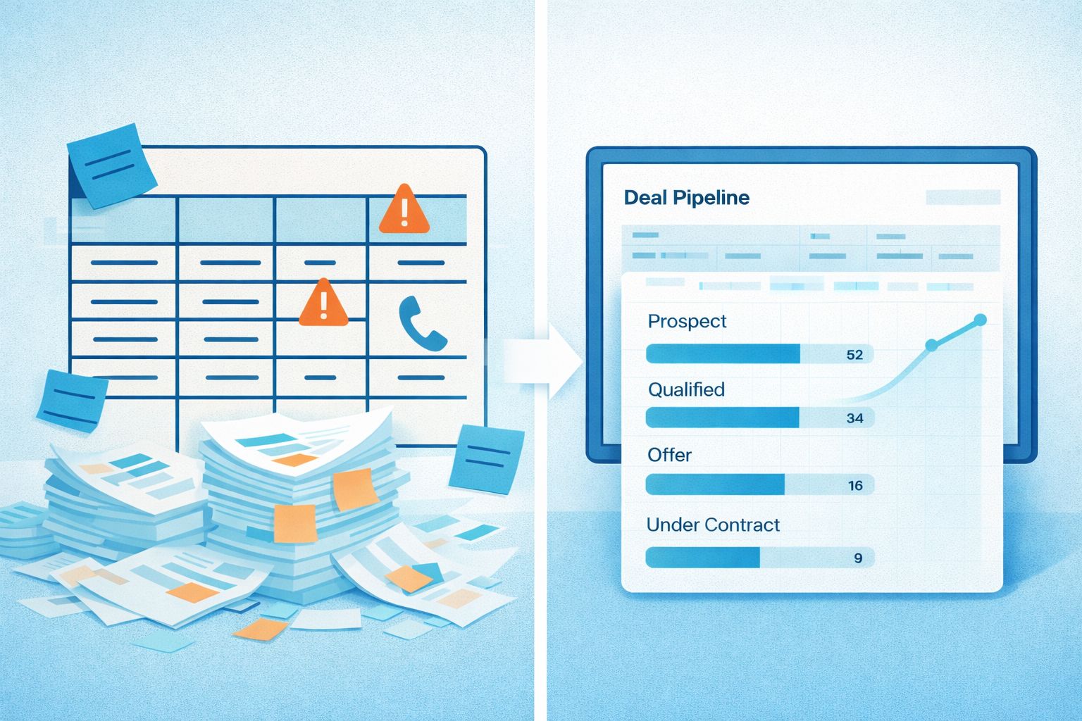 Side-by-side comparison showing a messy spreadsheet workflow versus a clean deal pipeline dashboard.