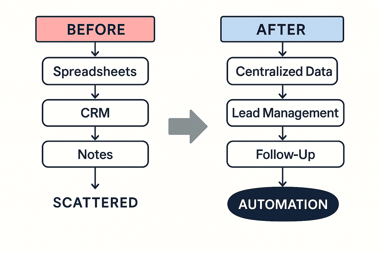 Before and after workflow chart showing transition from scattered systems to unified automation.