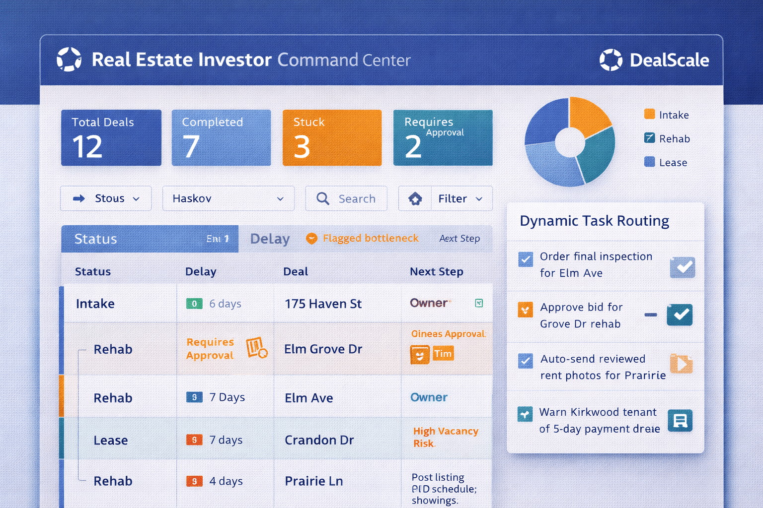 A portfolio dashboard showing deals by status, flagged bottlenecks, and routed next-step tasks.