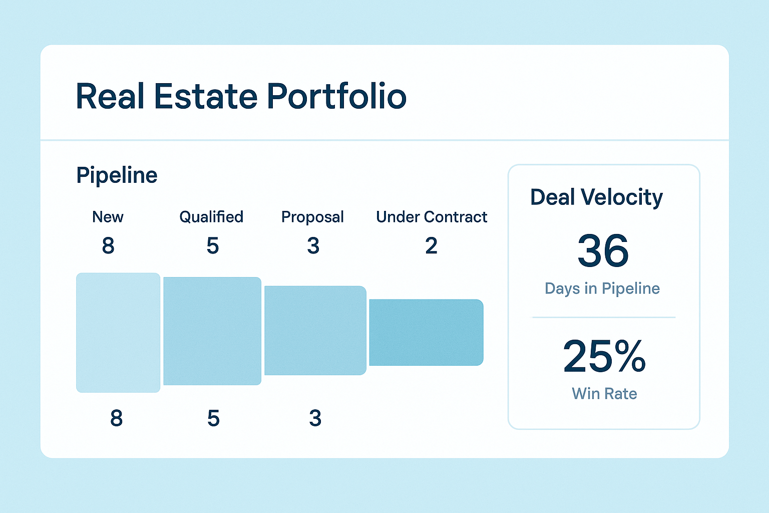 A clean real estate portfolio dashboard showing pipeline stages and deal velocity metrics.