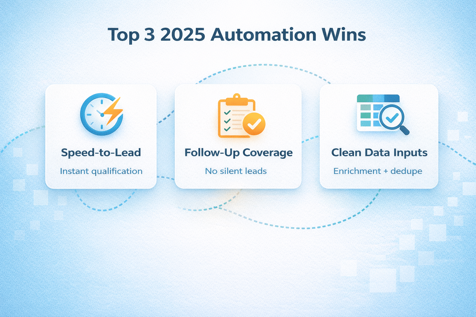 Infographic showing three key automation lessons from 2025: speed-to-lead, follow-up coverage, and clean data inputs.
