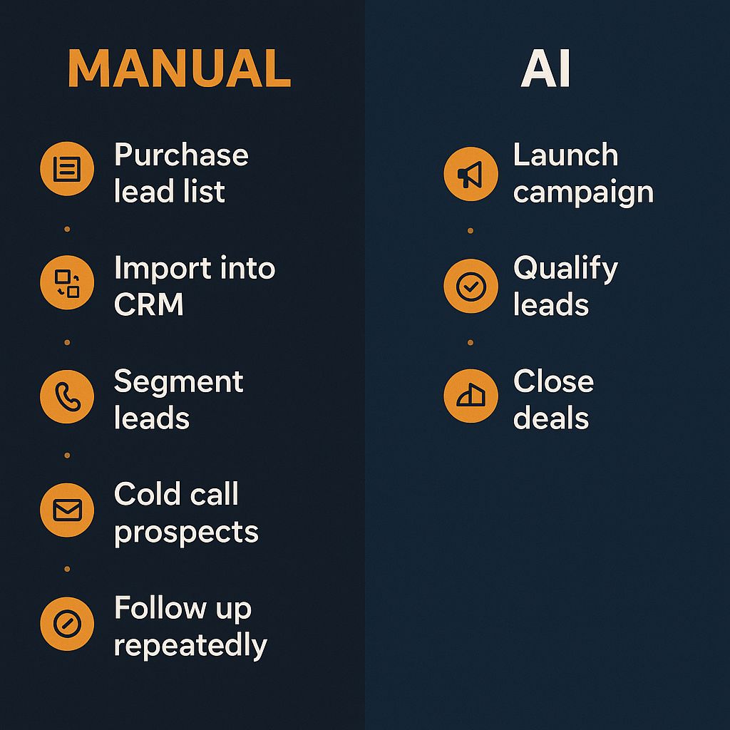Infographic comparing the steps of a manual lead generation process versus a streamlined, automated AI workflow for real estate investors.